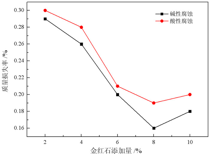 对不同低品位金红石精矿添加量条件下烧制的钼尾矿微晶玻璃进行化学稳定性分析,结果见图 5。可见,当低品位金红石精矿添加量相同时,微晶玻璃的耐碱腐蚀优于耐酸腐蚀,这是由于基础玻璃配方中含有较多的碱金属和碱土金属,同时硅氧四面体玻璃骨架及钙长石、透辉石结晶相在碱性环境中更稳定[18]。随着低品位金红石精矿添加量的升高,质量损失率不断降低,耐酸、耐碱腐蚀性能逐渐增强。当低品位金红石精矿添加量为8%时,耐酸、耐碱质量损失率最小,分别为0.19%、0.16%。分析认为,低品位金红石精矿有助于玻璃的微晶化,促进玻璃相向钙长石、透辉石相的转变,结构更加致密,耐酸、耐碱腐蚀性增强。继续增大低品位金红石精矿添加量,晶粒粗化,气孔率增大,表面粗糙,质量损失率变大,化学稳定性降低。