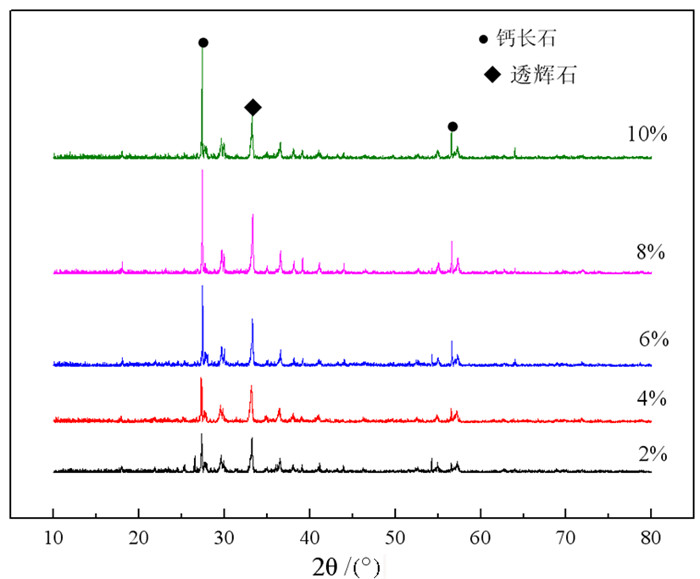 由图 6可以看出,当低品位金红石精矿添加量从2%提高到10%时,钼尾矿微晶玻璃中均有晶体析出,主要为钙长石和透辉石相。当低品位金红石精矿的添加量为2%、4%时,钼尾矿微晶玻璃的衍射峰强度较小,说明析出晶体少,还有玻璃相存在。随着低品位金红石精矿添加量的增加,衍射峰强度不断加强,析晶能力增强,晶体大量析出,使得玻璃的微晶化更加容易。因此,适宜的低品位金红石精矿添加量有助于玻璃的核化和晶化,促进晶体析出与发育,且不会影响晶相的种类。