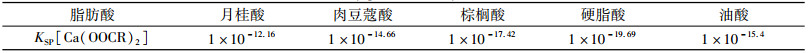 $ \begin{array}{l} {\rm{C}}{{\rm{a}}^{2 + }} + 2{\rm{RCO}}{{\rm{O}}^ - } \rightleftharpoons {\rm{Ca}}{\left( {{\rm{OOCR}}} \right)_2}\left( {\rm{s}} \right), {K_{{\rm{SP}}}}\left[ {{\rm{Ca}}{{\left( {{\rm{OOCR}}} \right)}_2}} \right] = \\ \;\;\;\;\;\;\;\;\;\;\;\;\;\;\;\;\;\;\;\;\;\;\;\;\;\;\;\;\left[ {{\rm{C}}{{\rm{a}}^{2 + }}} \right] \cdot {\left[ {{\rm{RCO}}{{\rm{O}}^ - }} \right]^2} \end{array} $ | (1) |