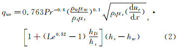 本文采用课题组已有重叠网格并行计算程序完成分离过程无粘外流解计算,输出物面网格点上的流动参数,如速度、压强、密度等,再根据完全气体状态方程,计算出其他所需流动参数,如温度、马赫数等。 1.2 表面热流密度计算