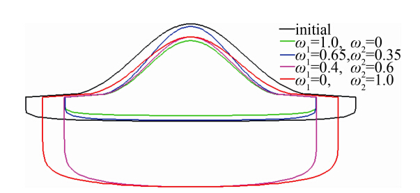 As shown in Table 1,the configuration that maximizes the lift-to-drag ratio conversely has the minimum volume utility ratio,and the one that maximizes the volume utility ratio has the minimum lift-to-drag ratio. The intermediate solutions have averaged values. The bottom cross sections of the optimal configuration with different weighting factors are shown in Fig. 3. There are obvious differences between the bottom cross sections,which one would be chosen depends on the designer’s requirements.