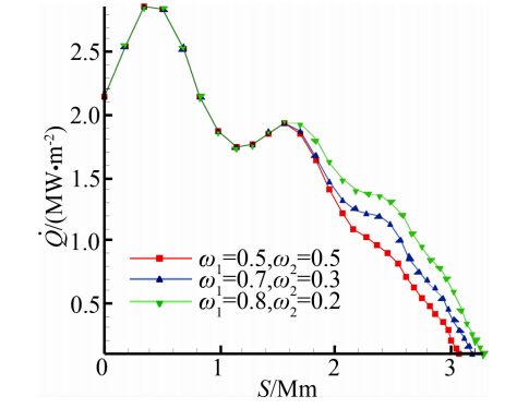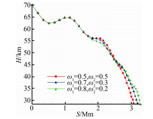 Table 2 shows the values of design variables,the range of the trajectory and the total heat load of the stagnation point of the optimal trajectories with different weighting factors,the increase or decrease to the initial values (Δ1 and Δ2) are also shown in it. The definitions of them are: