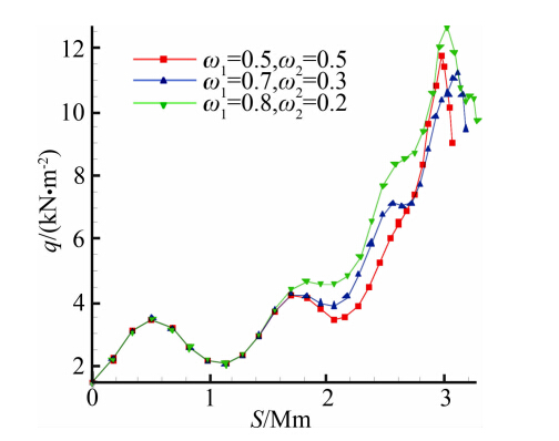 As shown in Table 2,the trajectory that maximizes the range have the maximum total heat load of the stagnation point,and the one that minimizes the total heat load of the stagnation point have the minimum range.The intermediate solutions have averaged values. The height,heat flux of the stagnation point and dynamic pressure along the optimal trajectories with different weighting factors are shown in Fig. 4~Fig. 6. There are obvious differences between each other,which trajectoy would be chosen depends on designer’s requirements.