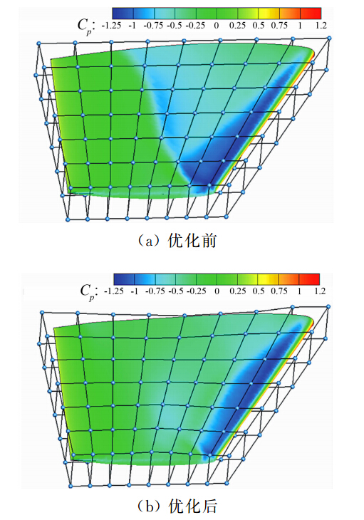 | 图 2 M6机翼优化前后表面压力分布以及控制点分布对比 Fig. 2 Surface pressure distribution and the distribution of control points of M6 wing before and after optimization |
