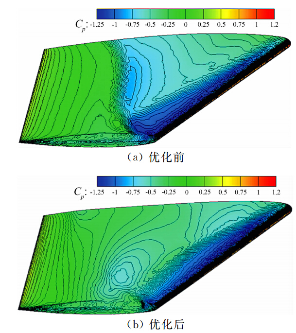 | 图 3 M6机翼优化前后表面压力分布对比 Fig. 3 Surface pressure isobar distribution of M6 wing before and after optimization |