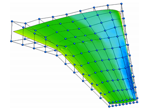 应用伴随方程法进行气动优化需要求解目标函数相对于设计变量的梯度,并且根据梯度信息进行设计变量的更新,从而得到新的几何外形,因此设计变量的选择对整个气动优化过程和结果有着决定性的影响。选择合适的设计变量不仅能大大减少优化设计时间,而且也是优化成功与否的关键[12]。在早期采用伴随方程法进行的气动外形设计工作中,每一个表面网格点都作为设计变量,在优化三维构型的情况 下,设计变量可能达到成千上万个,并且容易造成气动外形不光顺的情况[12]。R.Hicks[13]和其他人则用一族形函数对设计空间进行了参数化,这族函数既可用以产生新的几何外形,也可用以对原有的几何外形产生扰动,但这些形函数存在的问题是不能形成完备的空间,有可能得不到设计问题的最优解。另一类方法是使用B样条控制点作为设计变量,虽然也可以减少设计变量的个数,还可以进行局部控制,但在实际中发现,当控制点较多时,B样条容易产生波动[12],不适合于三维气动外形的设计。