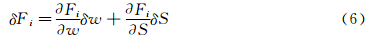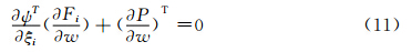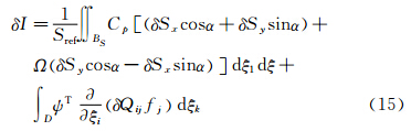 其中dBξ和dDξ分别为计算空间中的表面与空间积分单元,M与P取决于守恒变量w及计算空间矩阵S,分别表示目标函数表达式中的边界面积分部分和空间体积分部分。在满足流动控制方程约束条件下,气动外形的变化将导致流动变量变分δw与矩阵变分δS,因此目标函数的变化可表示为:定常状态下,对应于气动外形变化的Euler方程可表述为: