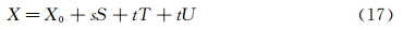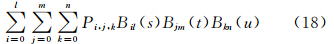 其中,i=0,1,…l;j=0,1,…m;k=0,1,…n。令X0(O)为局部坐标系的原点在全局坐标系下的坐标;X是控制框架内任意一点的全局坐标,s、t、u分别为该点的局部坐标,0≤s,t,u≤1,则有: