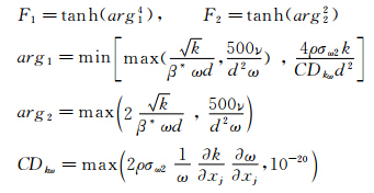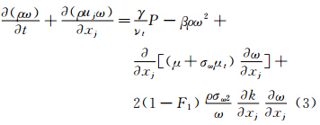 在CACFD软件中,软件作者对几种湍流模型曾进行了比较研究,认为对于超声速流动,在计算边界层和压缩拐角流动方面,Menter k-ω SST湍流模型具有较好的模拟能力,故本文计算中选择Menter k-ω SST湍流模型开展研究,Menter k-ω SST湍流模型的守恒形式是: