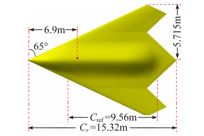 小展弦比飞翼布局基本外形参数见图 1。其前缘后掠角为65°,后缘后掠角为±47°,平均气动弦长 9.56 m,力矩参考点距头部长度为6.9 m,全长15.3 m,展长11.43 m。