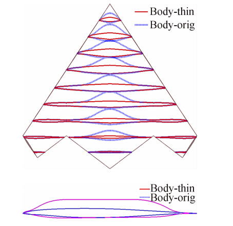 通过保持前缘半径和外翼剖面形状不变,降低飞翼布局的翼身相对厚度开展翼身相对厚度对小展弦 比飞翼布局气动特性的影响。图 2所示为翼身相对厚度降低前、后外形典型剖面形状的对比,可以看出两种翼身相对厚度飞翼布局的前缘半径和外翼剖面基本保持一致,图中Body-orig为翼身相对厚度为0.16(定义为厚飞翼布局);Body-thin为翼身相对厚度降低的飞翼布局,翼身相对厚度为0.08(定义为薄飞翼布局)。