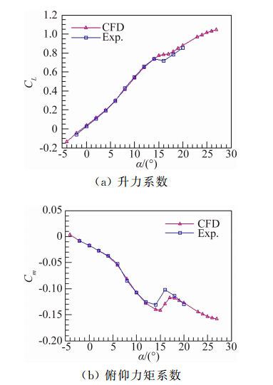 首先,在M=0.9条件下对飞翼布局升力和俯仰力矩系数计算结果与试验值进行了对比,如图 3所示。