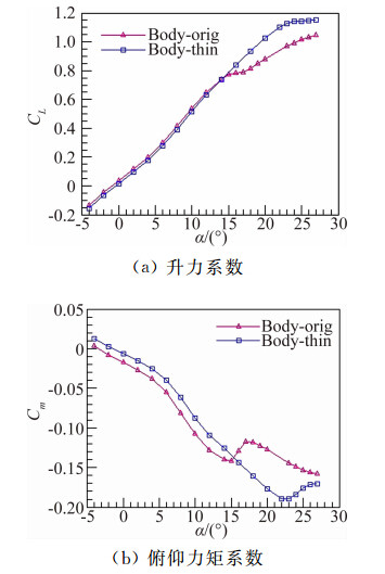| 图 4 M=0.9两种翼身相对厚度飞翼布局升力和 俯仰力矩系数随迎角变化的对比Fig. 4 Comparisons of lift and pitching moment coefficients versus incidence at M=0.9 |
