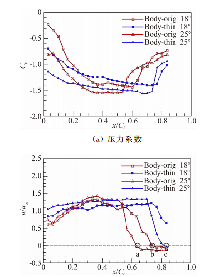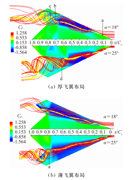 从图 5中可以看出当α=18°时,对于薄飞翼布局来说几乎在前缘(x/Cr=0)处即形成了稳定的前缘涡。而由于翼身相对厚度的影响,厚飞翼布局前缘涡形成的起始点在弦向x/Cr=0.1(图 5(a)中a点)处,涡轴沿弦向逐渐抬起并向翼身方向内偏,并且在x/Cr=0.7(图 5(a)中b点)位置前后,上翼面压力系数突变,涡核迅速膨胀,最终在x/Cr=0.78(图 5(a)中c点)位置处前缘涡开始破裂。迎角增大到25°时,厚飞翼布局前缘涡破裂点迅速前移至x/Cr=0.63(图 5(a)中d点)位置处。而薄飞翼布局在α=18°时,前缘涡形态无明显变化,也无涡破裂情况发生,迎角增大到25°时,在x/Cr=0.81(图 5(b)中a点)位置处前缘涡开始破裂。前缘涡的破裂使飞翼布局涡升力降低,升力线斜率下降,这也解释了图 4所示的薄飞翼布局升力和俯仰力矩系数在16°至23°迎角范围维持较好的线性,而厚飞翼布局在16°出现了升力线斜率下降和抬头力矩产生的原因。