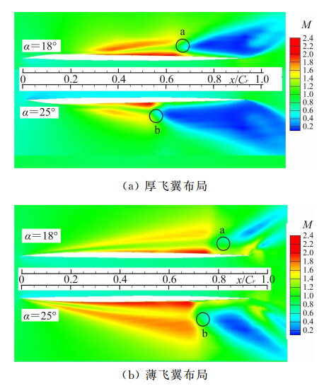 结合图 5的压力系数云图以及图 7涡核处沿弦向的马赫数云图可以看出在两种飞翼布局背风面都存在压力系数和马赫数的突变,说明在飞翼布局背风面激波以及激波与前缘涡的相互作用是存在的。迎角为18°和25°时,对于厚飞翼布局来说,激波位置分别处于x/Cr=0.7和0.57附近(图 7(a)中a、b点);对于薄飞翼布局来说,激波位置分别处于x/Cr=0.85和0.75附近(图 7(b)中a、b点)。