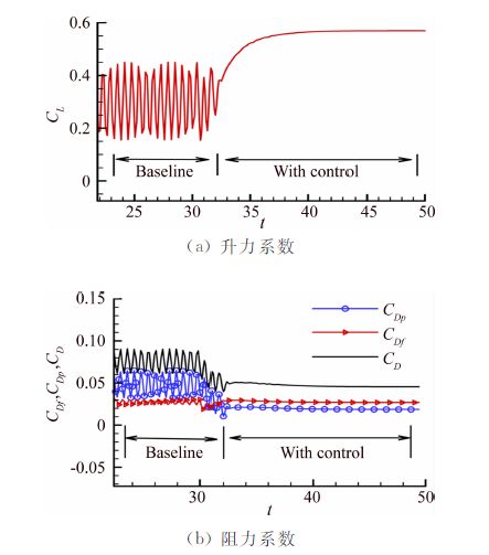 图 9给出了最优控制参数下的升阻力系数相对于基准状态的变化。升阻力系数曲线的变化可以明显地反映出增升减阻、消除非稳定波动的控制效果。图 10给出了最优控制下的压力系数,并与基准状态进行比较。可以发现,当升阻比达到最优解时,翼表面压力系数分布得到了明显改善,前缘附近的低压吸力峰值升高,下翼面压力系数获得了一定程度上的增加,这是导致升力系数获得增加的主要原因。图 9(b)显示在这组最优控制参数下,摩擦阻力系数的增加,使总阻力系数的减小幅度降低,根据式(5)可以得出FOM降低。另一方面,摩阻增加来源于抽吸控制下流向动量增加引起的壁面剪切应力增加,所以摩阻增加相当于消耗、抵消了一部分向控制系统注入的能量,导致整个控制系统的FOM减小,能效比降低。