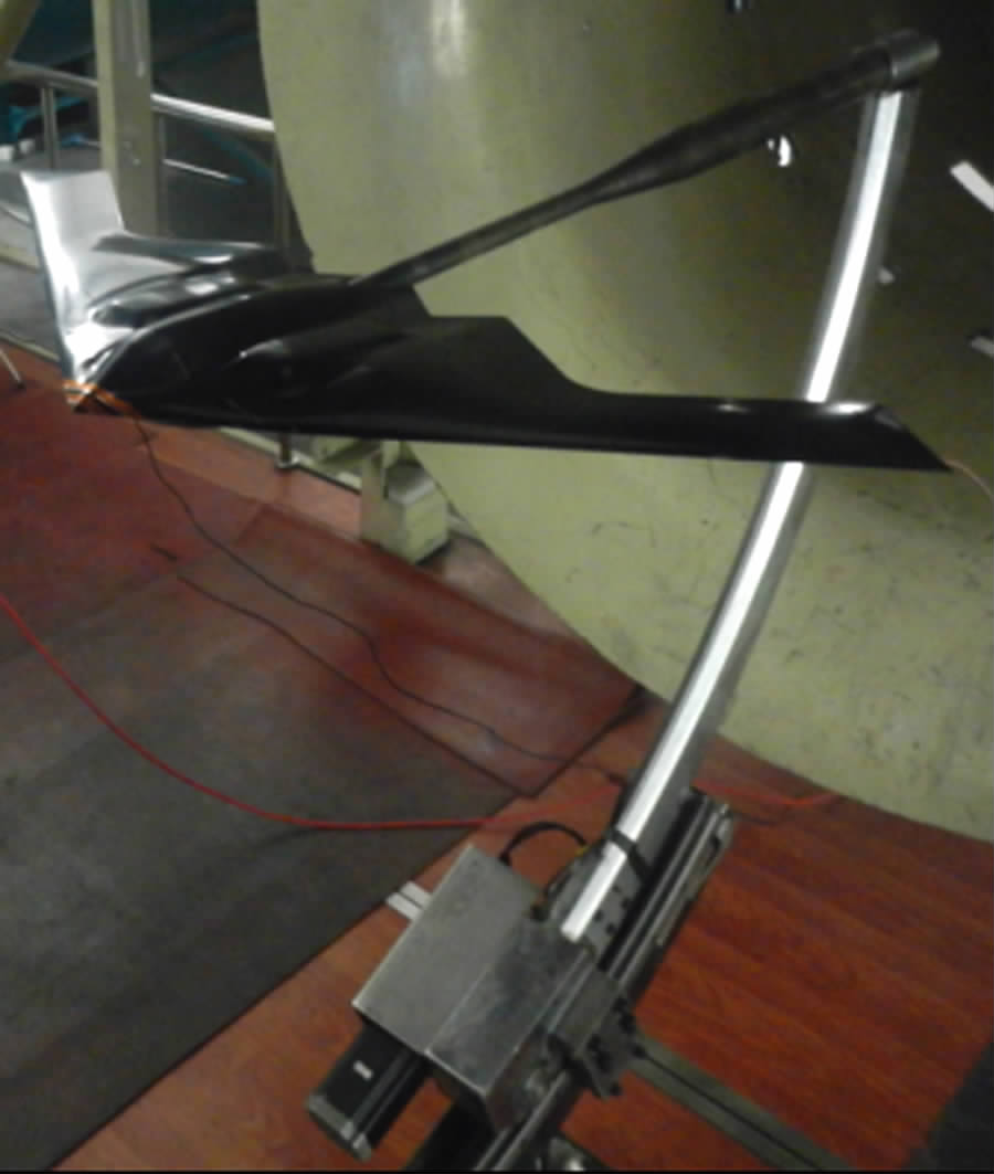 试验模型采用半弯刀机构尾撑方式支撑。模型通过尾支杆连接到半弯刀上,弯刀固定在风洞 β 机构上,弯刀机构改变模型的迎角,β 机构改变模型侧滑角。安装在支撑机构上的试验模型如图 3所示。