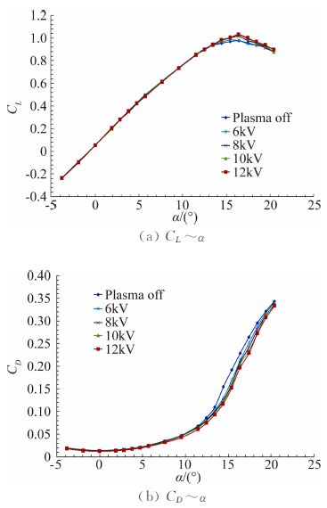 | 图 4 激励器电压对升阻特性影响 Fig. 4 Lift and drag coefficient effect of plasma actuator voltage |