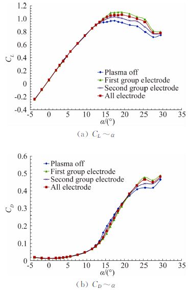 | 图 5激励电极数目对升阻特性影响 Fig. 5 Lift and drag coefficient effect of plasma actuator of electrode number |