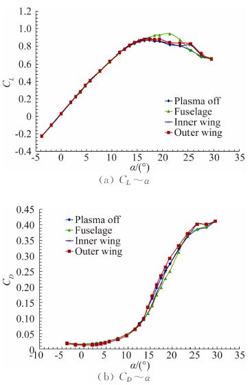 等离子体已广泛应用于平板边界层减阻 [14, 15]、翼型增升 [16, 17]和分离流动控制 [18, 19, 20, 21, 22]。其中Corke等进行了等离子体流动控制风洞试验 [23, 24],模型为4.16%缩比的1303UAV半模,风速为15 m/s,试验结果表明,在0°~20°迎角范围内,升力有明显的增加,在20°和30°之间的某些角度,升力甚至增加了25%;在二维NACA0015翼型表面前缘布置沿展向排列的激励器,从而增加最大升力系数和失速迎角,当来流风速21 m/s时,失速迎角增加7°,升阻比最大增加了340%。王勋年等 [25]研究了等离子体对NACA0015翼型失速分离的控制,来流风速20 m/s时,最大升力系数增加11%,失速迎角增加6°。