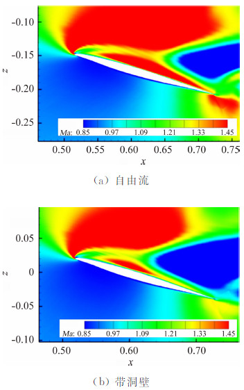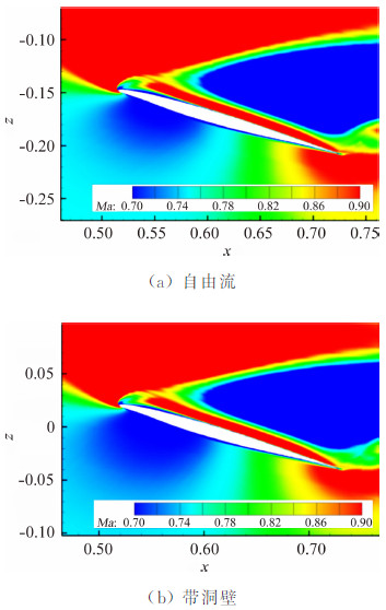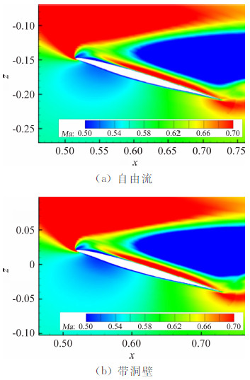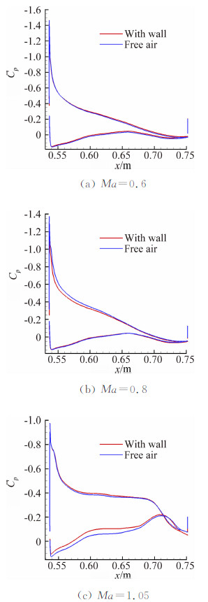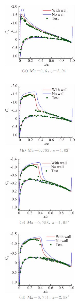 3 NACA0012算例验证为验证上述方法的可行性,基于NACA0012翼型的法宇航S3风洞二维测压试验数据[14]开展洞壁干扰计算研究。对带洞壁和自由流计算模型分别进行了数值模拟计算,并与风洞试验结果进行对比。图 1给出了不同工况下有无洞壁计算结果与试验结果的对比曲线。由图 1可见带开孔壁边界条件计算的压力分布及激波位置与试验结果吻合较好。洞壁干扰对翼面压力分布影响明显。