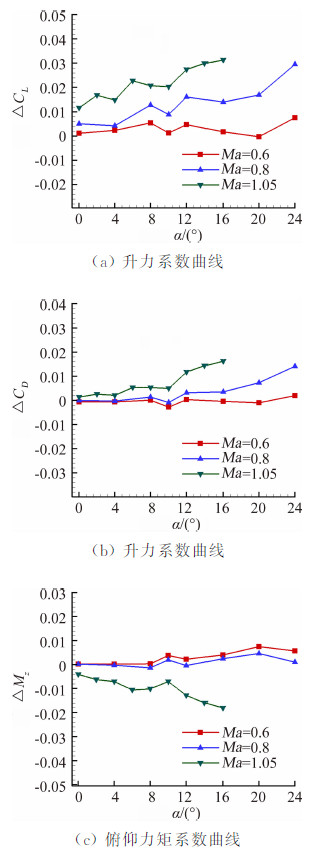 由图 11洞壁干扰量曲线可见,随着马赫数的增加洞壁干扰量逐渐增大。同一马赫数下,洞壁干扰量随着迎角的增加而增大,在Ma=1.05时最大。