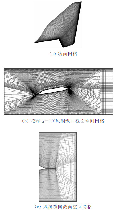 本文采用点对点对接(1-to-1)的分区多块网格技术生成模型带风洞试验段洞壁网格,不同模型迎角各生成一套网格。为尽量减少计算网格变化对数值求解结果的影响,保证各模型各迎角下带洞壁生成网格拓扑的一致性:模型自由流计算时,将洞壁边界条件延伸至远场,此时洞壁边界条件退化为内部流场;在近物面区域使用“O”型网格,在保证Y+≈1的同时,可以很好地保证近物面网格的正交性,在流场的其他区域使用“H”型网格单元填充。