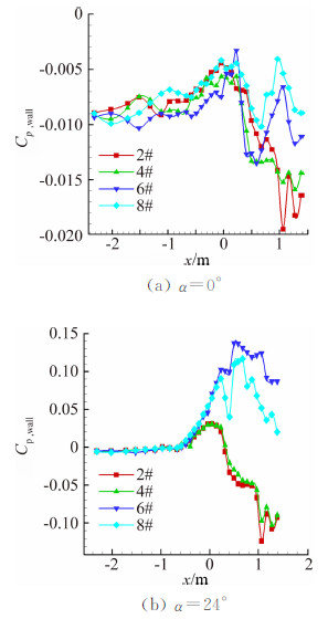 为了消除测压孔壁压数据不规则性、流场的不均匀性和支架的影响,对壁压数据采用了扣初值的处理方法。壁压测量试验除了进行试验段有模型的测力和测压试验外,还要进行空风洞有支架的测壁压试验,用前者的壁压系数减去后者的壁压系数,其差值作为在FL-2风洞模型试验壁压系数的最终输出值。以2#、4#、6#和8#测压管的扣除空风洞后的壁压数据为例,图 5是Ma=0.6时α=0°和24°的壁压数据曲线。