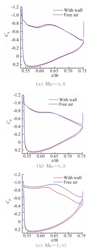 | 图 1 有无洞壁压力分布对比Fig. 1 Pressure distribution on NACA0012 |
