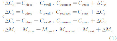 1 洞壁干扰修正方法本文所采用的洞壁干扰修正计算的研究方法是:分别计算模型在风洞中试验状态(带洞壁边界条件)及相应自由流飞行状态的全机气动力及流场情况,相应状态下计算结果的差值为该状态下洞壁对试验结果的干扰量,而试验结果加上计算获得的干扰量即为洞壁干扰修正值。以纵向洞壁干扰修正计算为例,式(1)分别给出压力系数、升力系数、阻力系数、俯仰力矩系数的洞壁干扰量计算公式及修正公式。