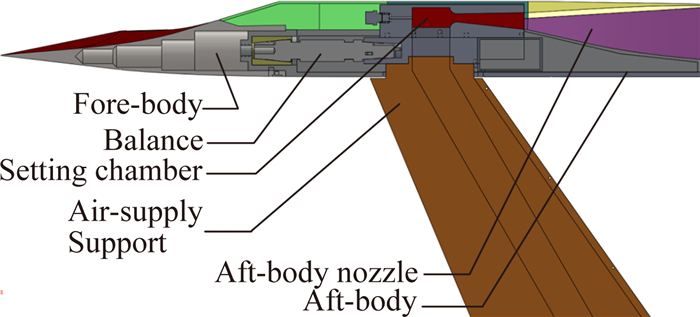 国内外对于包括吸气式升力体飞行器在内的各类飞行器尾喷流及其对飞行器气动特性等的影响开展了较多的研究工作[5, 6, 7, 8, 9, 10, 11, 12, 13, 14],而带喷流模拟的气动力风洞试验,也是研究飞行器尾喷流作用下气动特性的重要手段。如NASA在开展X-43飞行器喷流气动特性的研究中,即采用冷喷流模拟、飞行器后体与主体分离,并以天平测量模型后体气动力的风洞试验方法,研究了喷流对飞行器后体气动特性的影响。贺旭照等就吸气式高超声速飞行器后体尾喷流干扰问题开展了实验方案研究,探讨了模拟参数与风洞试验方法等问题。