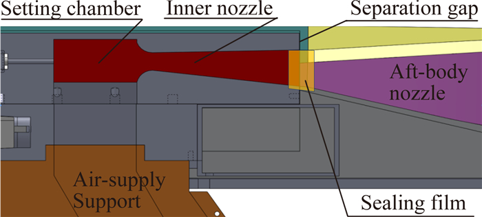 由于试验仅需研究飞行器“尾喷管”的喷流作用力及气动干扰效应,因此在“内喷管”与“尾喷管”交界处将模型分断:尾喷管保留在模型后段上,而模型发动机驻室和内喷管模块被独立出来,成为单独的模块,从结构上与模型的其他部分完全脱离(截断面处留有0.3mm左右的缝隙),只与模型背支撑相固联,其受到的直接作用力不会作用到天平上,因而供气管路、驻室和内喷管所受气流作用力对模型气动力测量不会造成干扰。通过更换不同设计参数的内喷管模块,可以模拟不同的喷流状态。为防止喷流模拟时喷管内气流进入缝隙以及模型内腔、直接作用到模型上而影响测量结果,试验时需要采取柔性密封措施对分断缝隙进行密封。本项试验研究中,采取了一种以柔性密封膜为密封材料的缝隙密封方法,并采用了特殊的密封工艺,既保证了缝隙密封的效果,又大大降低了缝隙密封措施对测量的干扰,使其干扰影响基本可以忽略不计。图 2给出了发动机驻室与尾喷管分断及缝隙密封结构示意图。