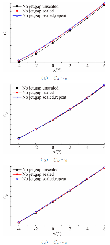 对比无喷条件下分断缝隙有、无密封的试验结果可以发现,CA、CN和Cm的变化规律完全一致,试验结果差异很小,两者仅CA差异相对明显,密封后比密封前略大1.4%左右;而CN和Cm无明显差异,一致性非常好(在0.5%以内),基本在常规气动力试验重复性精度水平以内。
