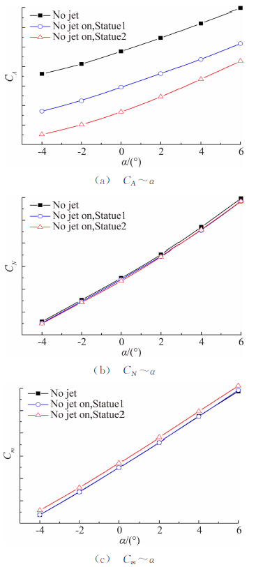从试验结果的不确定度分析数据来看,CA、CN和Cm的不确定度均在3%以内,与飞行器常规气动力试验数据的不确定度也相当。 2.2.3 不同状态试验结果通过更换不同的内喷管模块,分别模拟了升力体飞行器进气道通气状态(Statue1)和超燃发动机工作状态(Statue2)两种工况,并获得了不同状态的测力试验结果。图 4给出了无喷、Statue1和Statue2三种不同模拟状态的测力试验结果对比曲线。
