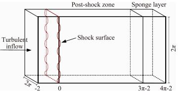 2 3D Turbulence Across a Supersonic Shock Wave 2.1 Problem SetupThe 3D test case considered here concerns an initial turbulence disturbance at the inflow boundary interacting with a stationary supersonic planar shock wave. The problem has been studied by previous investigators,mainly related to DNS computations; see e.g. [24, 41, 43]. Here we choose the configuration considered in the DNS study of [24]. Fig. 1 shows a schematic of the problem setup. The computational domain is -2≤x≤-2+4π,0≤y≤2π and 0≤z≤2π. The grid is uniform in all directions with the spacing in x several times finer than in y and z (see [24] for explanation). We solve the filtered governing Eqs.(1)-(3) in a non-dimensional form. The Yee et al. filter scheme with Ducros et al. flow sensor[16] is used for integration of the Ducros et al. [31] splitted form of the governing equations. The spatial base scheme is the eighth-order central differencing and the nonlinear filter scheme is the dissipative portion of the seventh-order WENO scheme (WENO7). This nonlinear filter scheme,including the Ducros et al. splitting of the governing equation,is denoted by WENO7fi + split (or WENO7fi for ease of discussion). Since the initial data consists of a planar shock in the x-direction,numerical dissipation should be mainly needed in the x-direction. In order to obtain more accurate results,WENO dissipation is employed only in the x direction at the postprocessing stage of the Yee et al. filter. The inflow and outflow boundary conditions are applied in the streamwise direction and periodic boundary conditions are applied in the transverse directions.