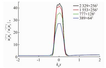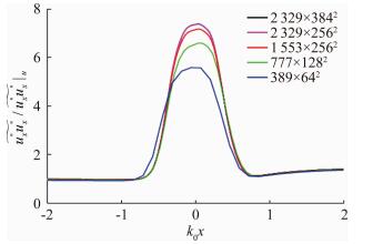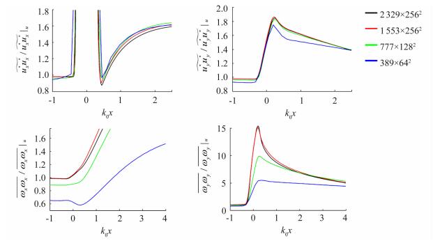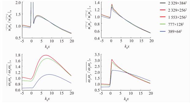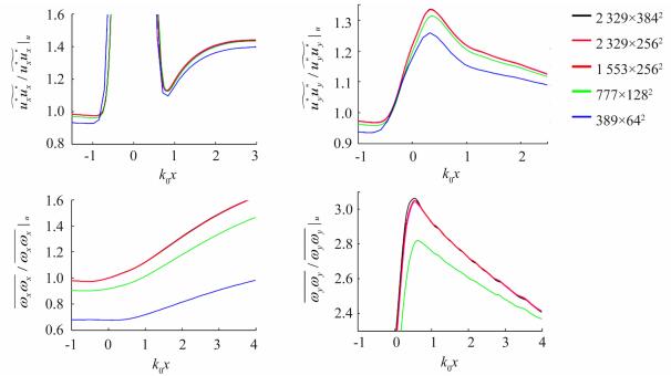 2.2.2 DNS Grid Refinement StudySince the peak values of the Reynolds stress in the streamwise direction for the medium and fine grid(777×1282and 1553×2562) in our preliminary study [20] are not quite converged,in order to confirm the proper grid size for the DNS solution to be used as a reference solution for our LES comparison,a five-level DNS grid refinement is performed for M=1.5. The five grids are the original three grids together with two finer grids of 2329×2562and 2329×3842. For the M=3 case,a smaller time step has to be used for stability considerations. Due to the higher CPU time required for M=3,only one added grid refinement(2329×2562) over our earlier work is performed.