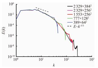 | Fig. 11 DNS,WENO7fi,M=1.5,velocity spectrum, slice at x=0: Five-level DNS grid refinement study on grids with 389×642,777×1282,1553×2562, 2329×2562and 2329×3842points. |