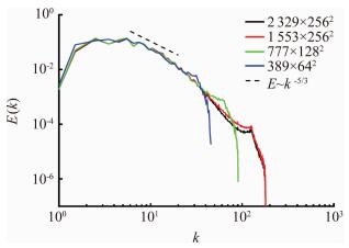The spectra of the DNS grid refinement study are shown in Figs. 11 and 12. All the plots correspond to the plane x= 0 which is slightly behind the shock location. The spectra for all the grids match at the inertial range,while showing typical dependence on the grid resolution in the dissipation range. The analysis of spectra obtained on a grid 389×642confirms the validity of applying LES modeling even to this low-resolution grid.