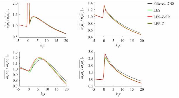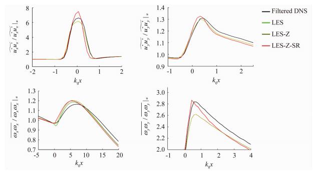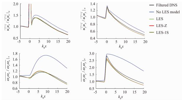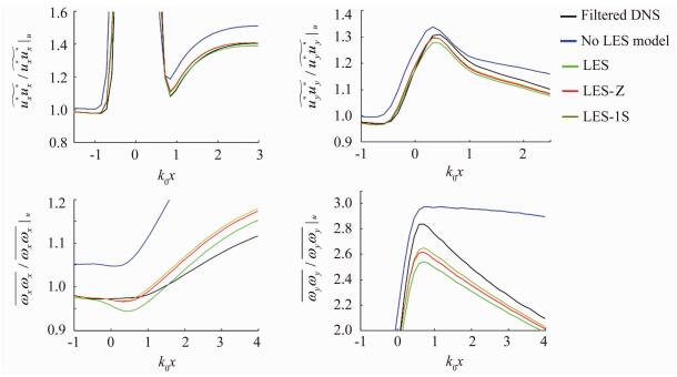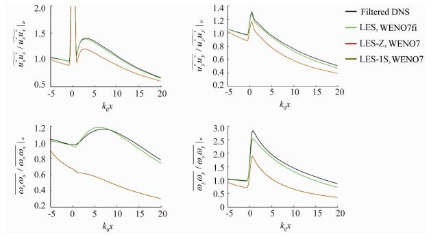 | Fig. 14 LES,WENO7fi,M=1.5: Comparison to filtered DNS data of the statistics obtained by LES with different filtering procedures (original SGS LES,LES-Z,and LES-1S) on grid 389×642. Top row:streamwise (left) and transverse (right) Reynolds stress components. Bottom row: streamwise (left) and transverse (right) vorticity components. |