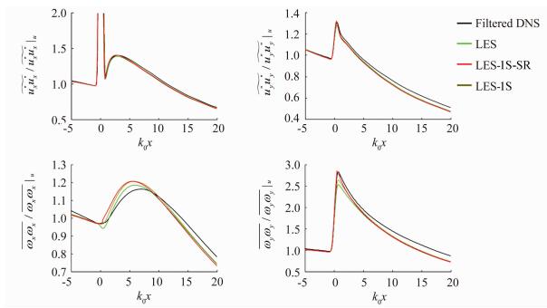 | Fig. 17 LES,WENO7fi,SR vs. no SR using LES-1S,M=1.5: Comparison to filtered DNS data of the statistics obtained by LES with different filtering procedures (original SGS LES,LES-1S-SR,and LES-1S) on grid 389×642. Top row: streamwise (left) and transverse (right) Reynolds stress components. Bottomrow: streamwise (left) and transverse (right) vorticity components. |