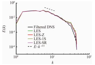 | Fig. 19 LES,WENO7fi,M=1.5,velocity spectrum: Comparison of velocity spectrum among different LES SGS filtering procedures (original SGS LES,LES-Z,LES-1S and LES-SR) at plane x=0 and the filtered DNS on grid 389×642. |