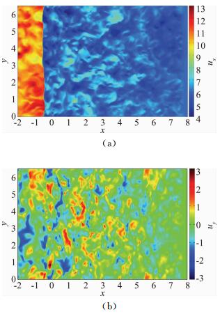 | Fig. 2 DNS on grid of 1553×2562 points by WENO7fi, M= 1.5: Instantaneous velocity field ux (a) and uy (b),slice z=const. |