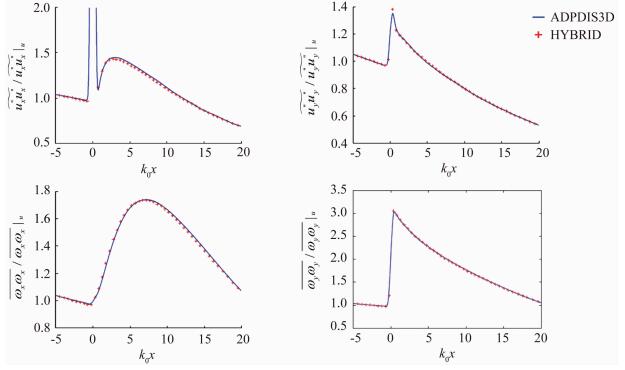 The comparison between the DNS statistics obtained in this work using the ADPDIS3D [6] code and the data obtained from digitizing the solution [24] is shown in Fig. 3. The results obtained in both of these works are in good agreement. The grid resolution in the vicinity of the shock is the same. In Larsson & Lele [24] grid clustering near the shock has been employed,resulting in a smaller grid size,694×2562. The work [24] employs the HYBRID code,which also uses a Ducros et al. flow sensor for shock detection. However,in Larsson & Lele [24] WENO dissipation has been introduced at every Runge-Kutta stage,whereas the Yee et al. scheme allows decreasing the computational cost by employing WENO dissipation only after the full Runge-Kutta step.