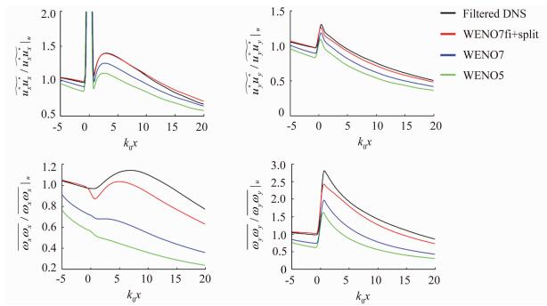The comparison between the filtered DNS data and the results obtained with different numerical schemes on the coarse grid with 389×642points is shown in Fig. 4. Here we compare the results obtained by the fifth-order WENO (WENO5) and WENO7 with the results obtained by the filter counterpart of WENO7 with Ducros et al. splitting of the governing equations (WENO7fi+split). The comparison of WENO5,WENO7 and WENO7fi+split is shown in Fig. 4. For Fig. 4,each of the considered schemes is employed in all three directions. Solution by WENO7fi is closer to the filtered DNS solution than WENO5 and WENO7.WENO5 is far too dissipative for DNS computation with this coarse grid.