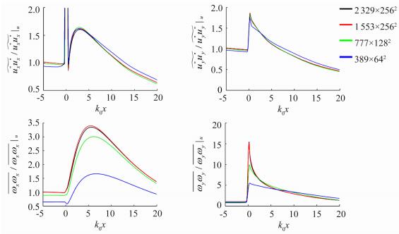 In conclusion,the present DNS refined study indicated that the 1553×2562grid for M=1.5 can be used as a DNS reference solution for our LES study.