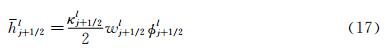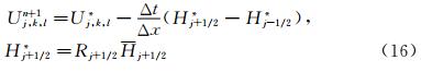 where Hj+1/2* and Hj-1/2* are “filter” numerical fluxes in terms of Roe’s average states based on U*. Rj+1/2 is the matrix of right eigenvectors of the Jacobian of the inviscid flux vector in terms of Roe’s average states based on U*. Denote the elements of the filter numerical flux vector Hj+1/2 by hj+1/2l,l=1,2,…,5,where hj+1/2l has the form