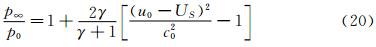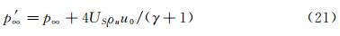 where p0 is the inflow mean pressure,u0 is the mean inflow velocity,c0 is the mean inflow speed of sound and US is the shock velocity. As the inflow condition is turbulent,the Rankine-Hugoniot conditions are valid only instantaneously but not in average. After an initial guess based on (20) the outflow pressure is refined by an iteration procedure,integrating the governing equations on a coarse grid and updating the pressure according to the formula