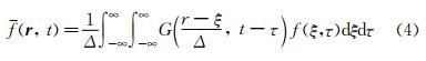 where G(x,t) is the filter kernel in physical space and Δ is the filter width. The Favre filtering operation is denoted as