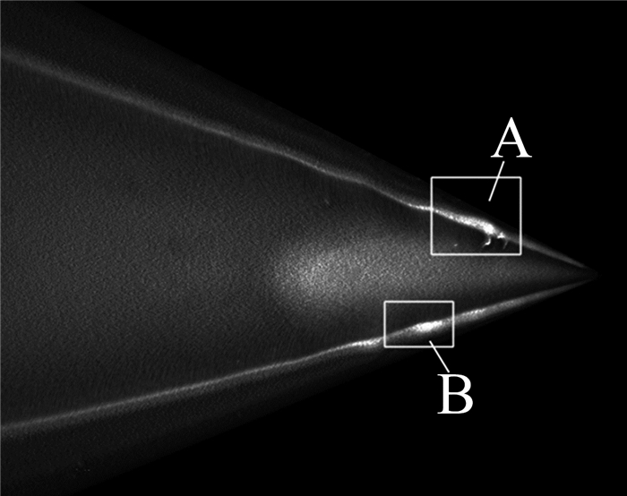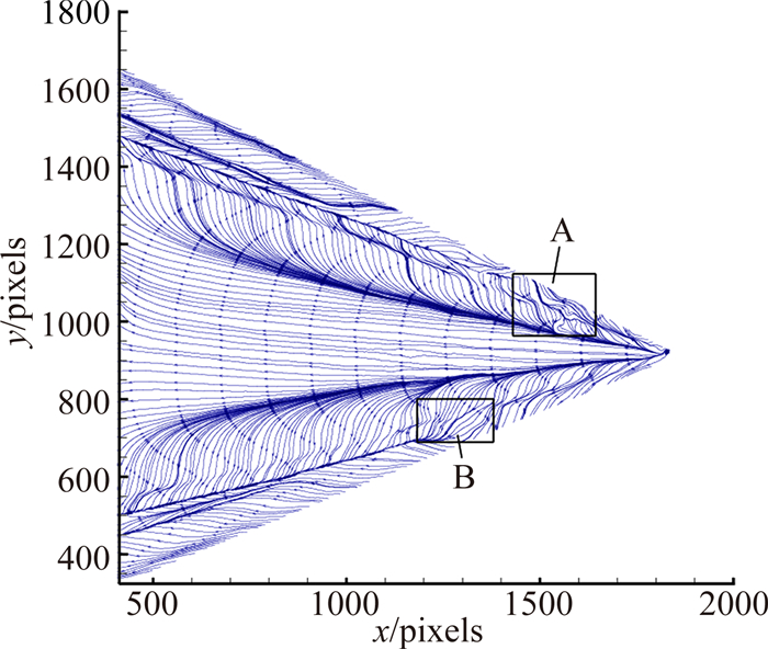 实验采集到的荧光油膜图像如图 11,经过计算获得的表面摩擦应力线如图 12。通过观察图 11和图 12中的A、B区可以发现,油膜图像在A、B区内汇聚过多,引起了油膜厚度增加(>100μm),对该位置模型表面流动产生影响。而且由于内含荧光物质的增加导致了图像过度曝光,影响表面摩阻的处理结果,使二次涡分离线在此处中断。引起这种现象的原因可能是由于模型表面存在区域加工不均匀,这在以后的工作中需加以改进。