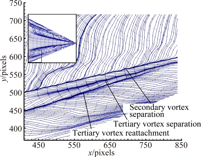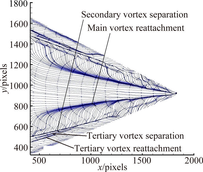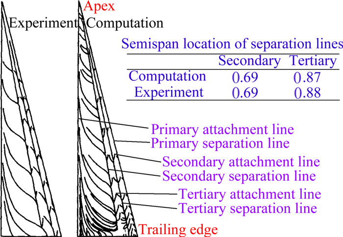 实验结果与Thomas J L[26]提及的三角翼上方存在三次涡结构结果相吻合。Thomas J L[26]采用迎风格式有限体积N-S方程对低速薄三角翼型上方流(涡)场进行计算,计算结果表现出三角翼上方主涡、二次涡和三次涡的相对位置和特性。主涡Cp的分离线Sp从三角翼前缘线开始,在Ap再附;在Ss位置由于逆压梯度,诱导了二次分离及二次涡Cs,产生二次涡再附线As。同样,二次涡在St位置诱导了三次分离和三次涡Ct,产生三次涡再附线At(如图 15所示)。Thomas J L的计算分析结果与极限流线的实验结果进行了比较,证实了二次分离与三次分离线的存在(见图 16)。本次三角翼模型上表面摩擦应力线结果与Thomas J L的计算分析结果及极限流线的实验结果完全一致,证明了本次实验结果的有效性。